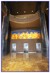 amplia y sobria sala con área de espera, de finos pisos de mármol,